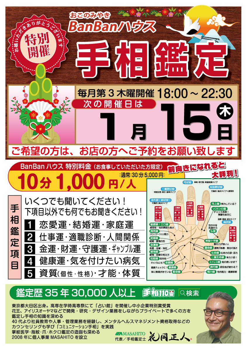 ■1月15日(木)「BanBanハウス」手相鑑定出演